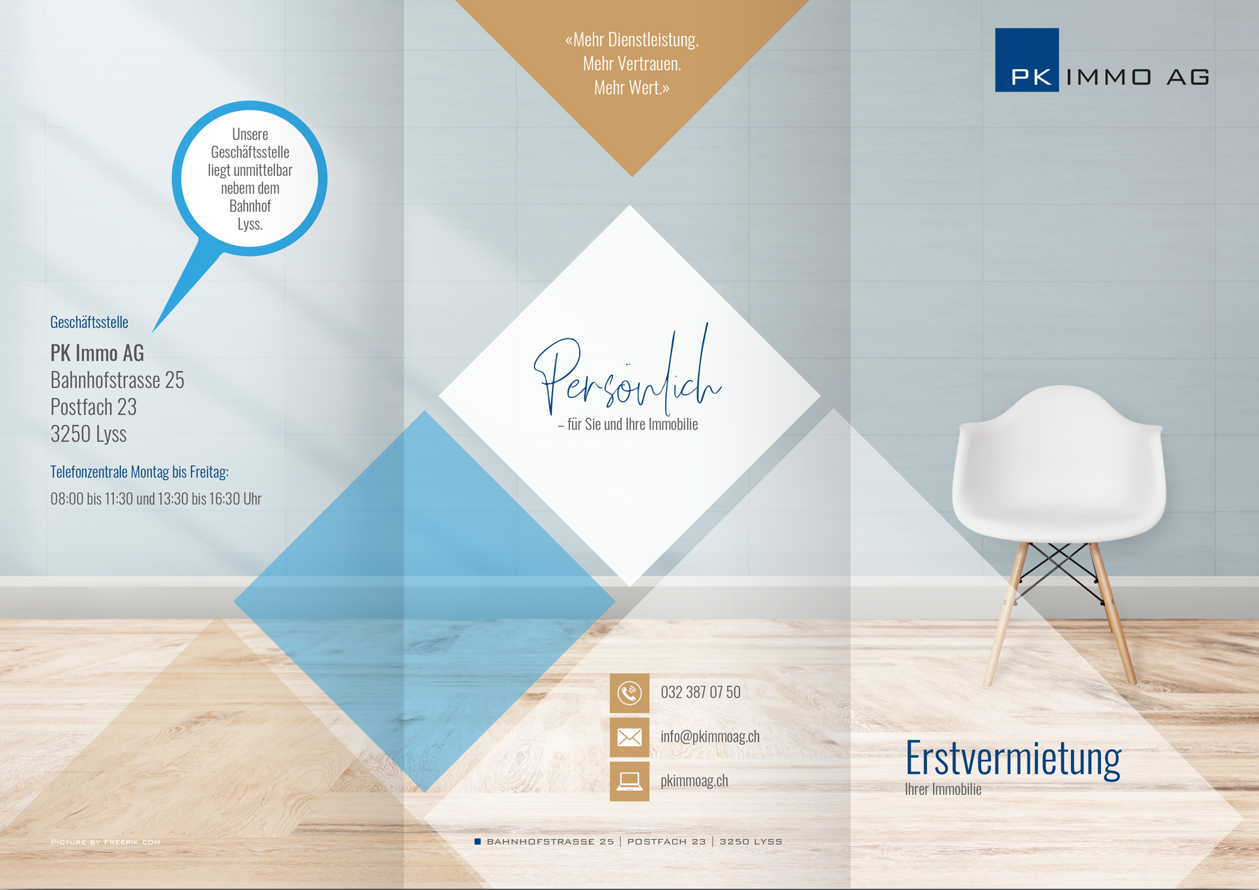 Die Liegenschaft Kirchlindachstrasse 25, Zollikofen wurde einer Totalsanierung unterzogen und präsentiert sich nun in neuem Glanz. In der frisch sanierten Liegenschaft finden Sie acht familienfreundliche 4½-Zimmerwohnungen und vier grosszügige 3½-Zimmerwohnungen, welche im Eigentumsstandard erstellt wurden und somit mit hochwertigen Materialien ausgestattet sind. Die grosszügigen Balkone laden zum Verweilen von gemütlichen Stunden ein. Zudem profitieren die Bewohner von einer exklusiven, grandiosen Sicht auf das Bergpanorama. |
