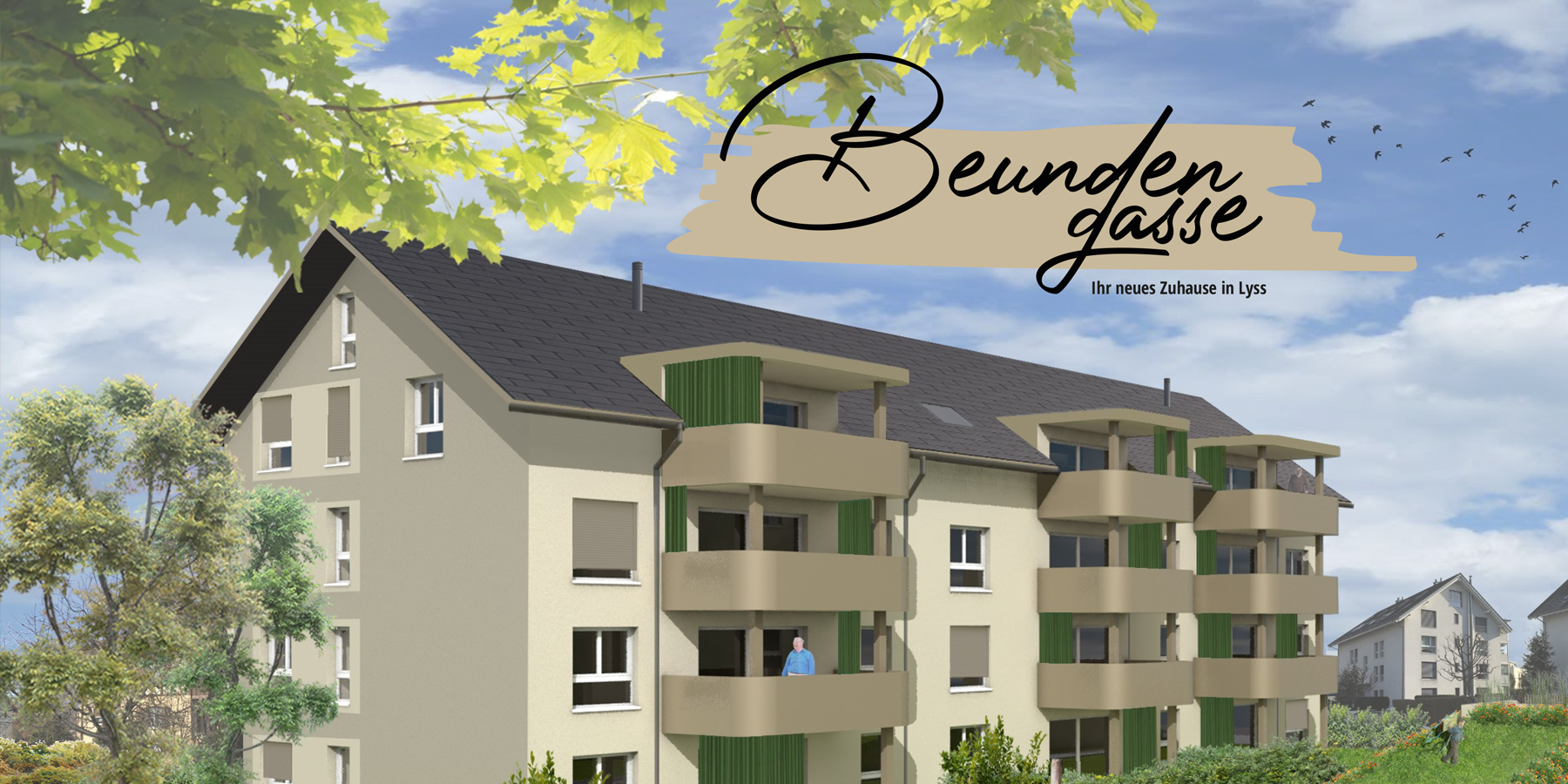 In der Wohnüberbauung Beundengasse Lyss entstehen unter der Bauherrschaft der Baupartner AG zwei Neubauten mit insgesamt 20 Eigentumswohnungen und einer Autoeinstellhalle. Mit charmanten 2 1⁄2- sowie geräumigen und familienfreundlichen 4 1⁄2-Zimmerwohnungen, teilweise mit Galerie, entsteht ein interessanter Wohnungsmix. Grosszügige Balkone und Sitzplätze zum Verweilen und Geniessen runden das ruhige Wohnen in der Überbauung Beundengasse ab. |